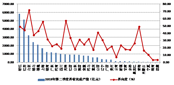 圖4 2018年上半年各地區跨省完成的建筑業總產值及外向度